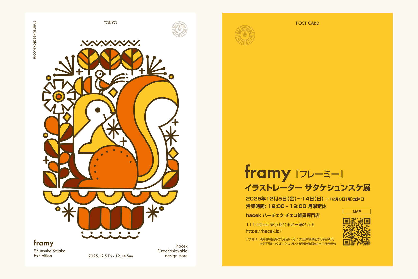 東京・蔵前にあるチェコ雑貨の専門店háček(ハーチェク)にて個展framy(フレーミー)を開催します。十数点にもおよぶ新作原画作品やプリント作品を展示、グッズ販売いたします。ぜひ御覧ください。