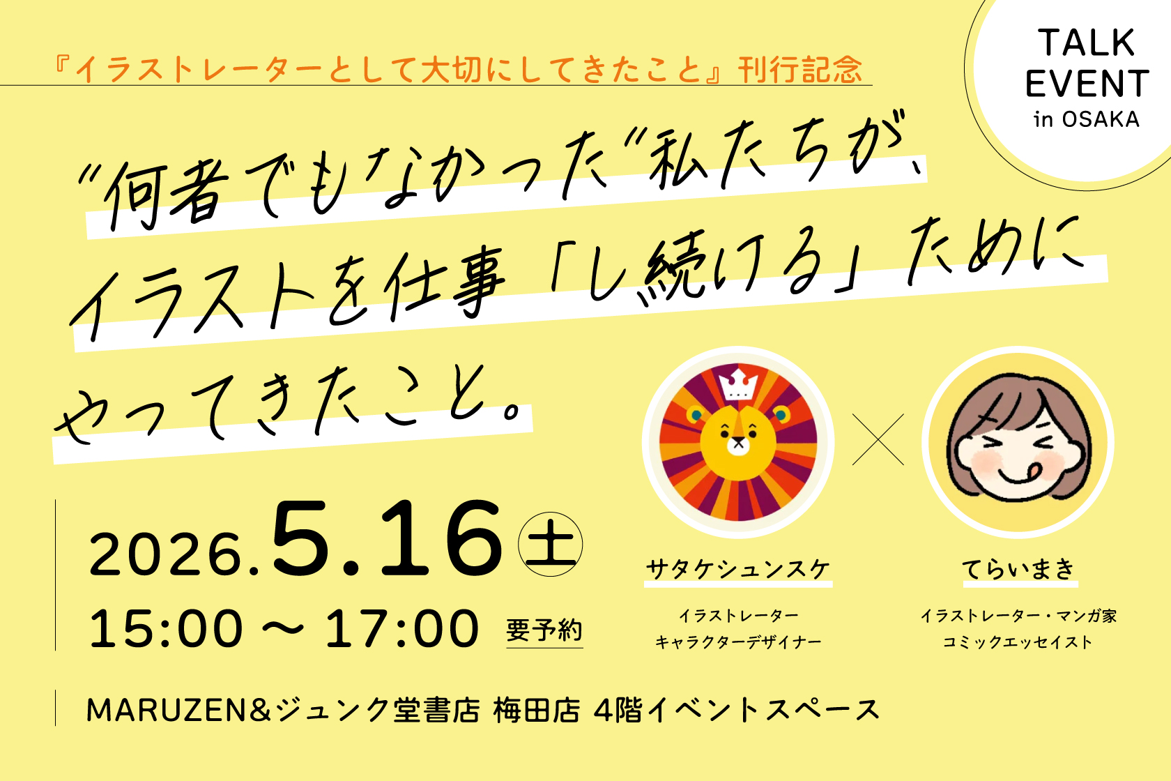 2026年5月16日(土)、MARUZEN&ジュンク堂書店梅田店にて、『イラストレーターとして大切にしてきたこと 仕事に“なるまで”と“なってから”』(日本実業出版社)刊行を記念して、てらいまきさんをゲストに迎え、クリエイターのための対談イベントを開催します。