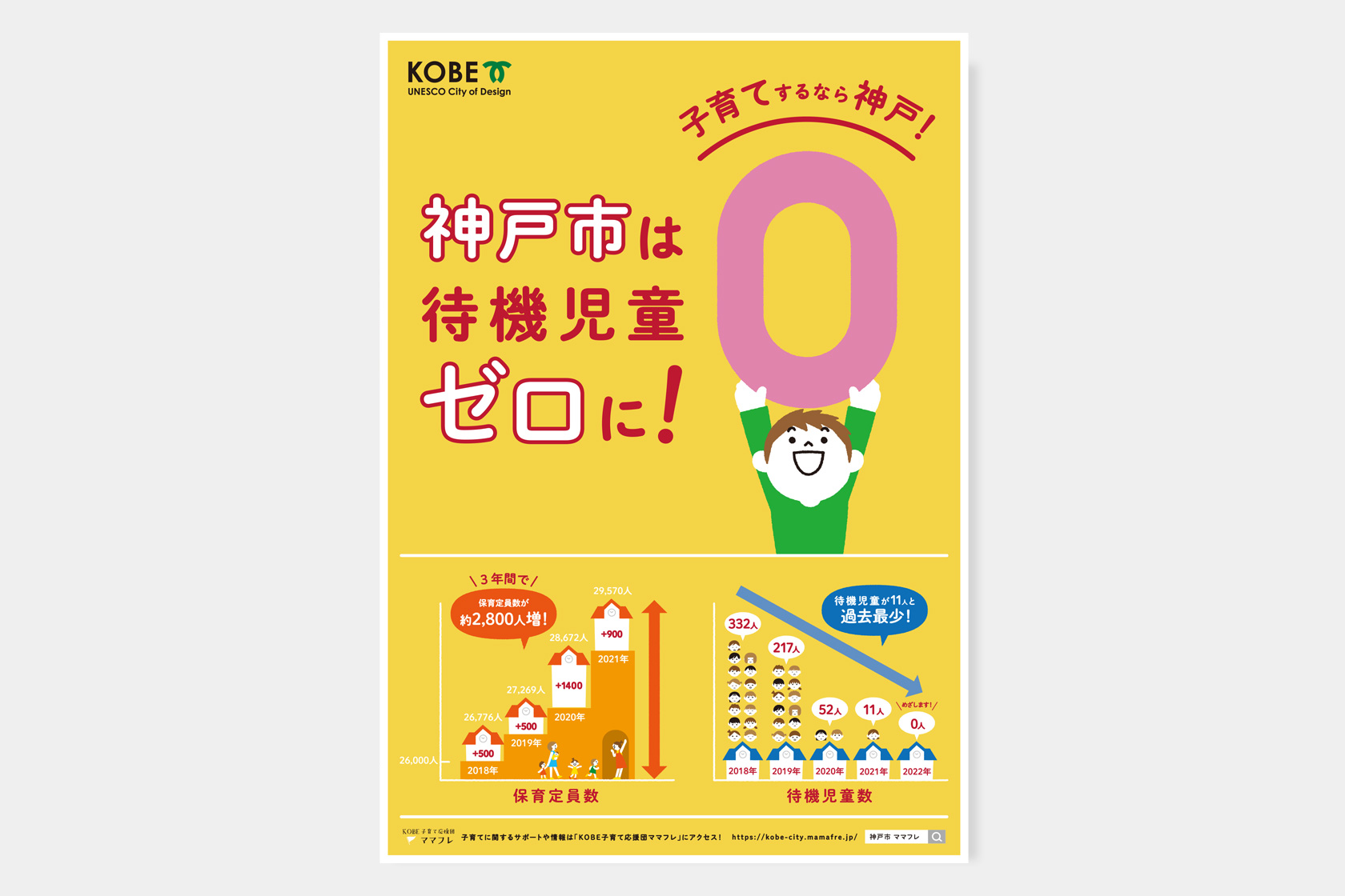 神戸市の子育てに関する行政サービスを紹介する「KOBE子育て応援団ママフレ」の2022年度 待機児童ゼロを目指す広告用イラストレーションを作成しました。